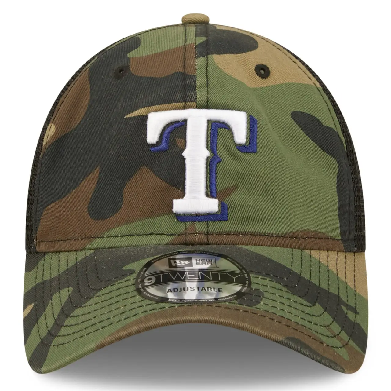 Add flair to your game day outfit with this New Era 9TWENTY Trucker hat. A bold Texas Rangers logo on the front panels offers an eye-catching contrast against the distinct camo pattern. Mesh panels promote breathability, while a snapback closure customizes to a comfortable fit.